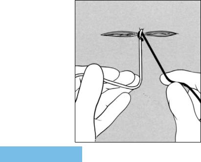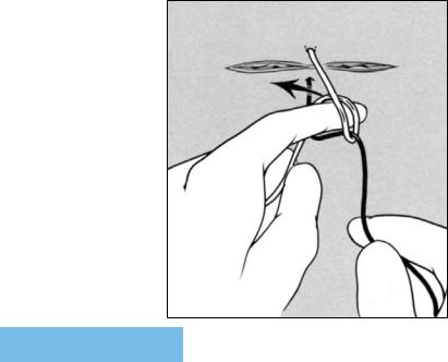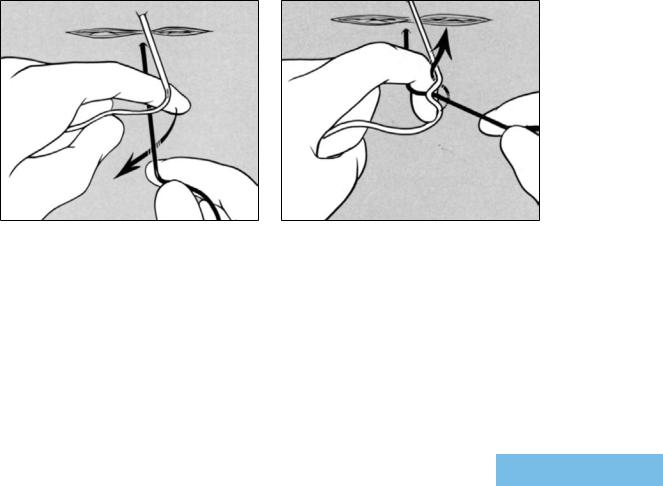 While grasping the suture end exiting from the farther side of the wound between the tips of the left thumb and index finger, the surgeon supinates the left wrist so that the free suture end is positioned over the tips of the long, ring and
