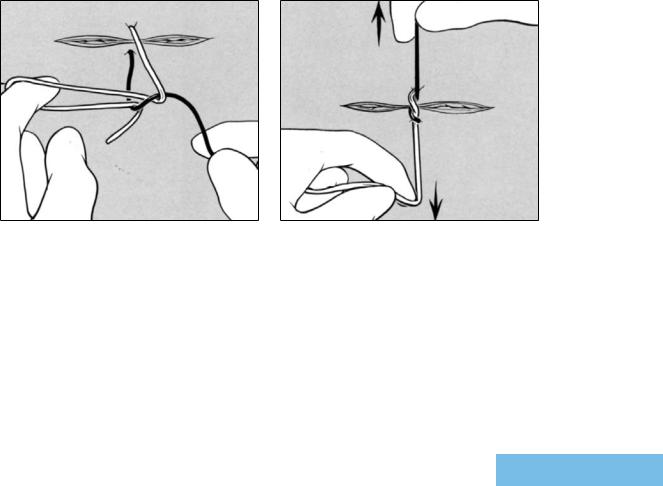 For the left index finger to bring the entire suture end up (arrow) through the loop, the left hand must release its grip of the suture. During this interval, tension cannot be maintained continually on the first throw, allowing the first-throw suture loop to widen, with subsequent partial separation of the wound edges.