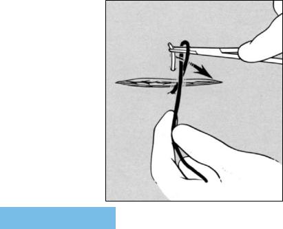 The tips of the needle holder jaws grasp the suture end and withdraw (arrow) it through the first suture loop. The resulting first throw will have a figure “8” shape.