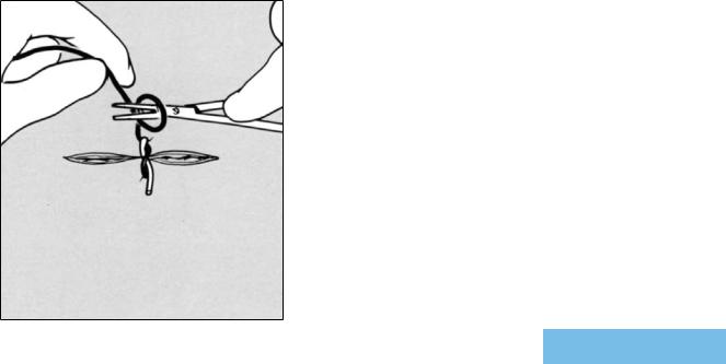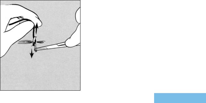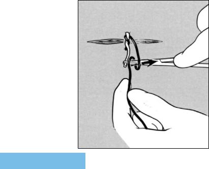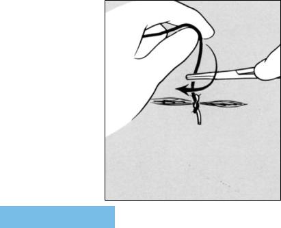 The figure “8” shape throw will be converted into a rectangular-shaped throw by reversing the direction of the hand movement. The left hand moves away from the surgeon, while the needle holder held in the right hand advances toward the surgeon. This singlewrap throw is advanced to the wound surface by applying tension in a direction (arrows) that is perpendicular to that of the wound. Once the first throw of the square knot contacts the skin, the edges of the mid-portion of the wound are approximated.