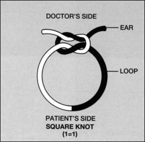 A tied suture has three components (Figure 1). First, the loop created by the knot maintains the approximation of the divided wound edges. Second, the knot is composed of a number of throws snugged against each other. A throw is a wrapping or weaving of two strands. Finally, the “ears” act as insurance that the loop will not become untied because of knot slippage. The doctor’s side of the knot is defined as the side of the knot with “ears,” or the side to which tension is applied during tying. The patient’s side is the portion of the knot adjacent to the loop.
