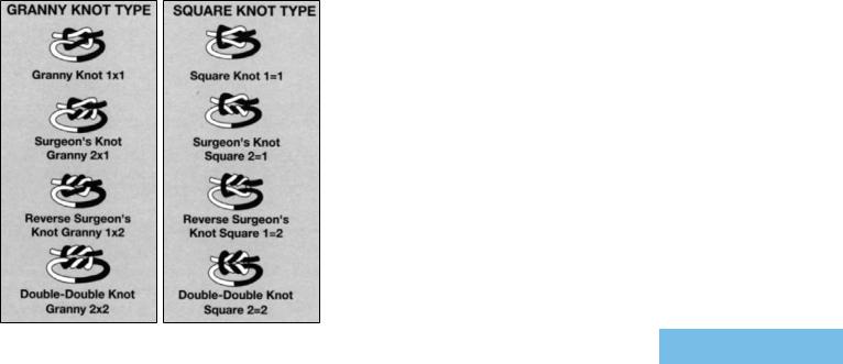 Each throw within a knot can either be a single or double throw. A single throw is formed by wrapping the two strands around each other so that the angle of the wrap equals 360°. In a double throw, the free end of a strand is passed twice, instead of once, around the other strand; the angle of this double-wrap throw is 720°. The tying of one or more additional throws completes the knot. The configuration of the knot can be classified into two general types by the relationship between the knot “ears” and the loop (Figure 2). When the right “ear” and the loop of the two throws exit on the same side of the knot or parallel to each other, the type of knot is judged to be square (reef). The knot is considered a granny type if the right “ear” and the loop exit or cross different sides of the knot.