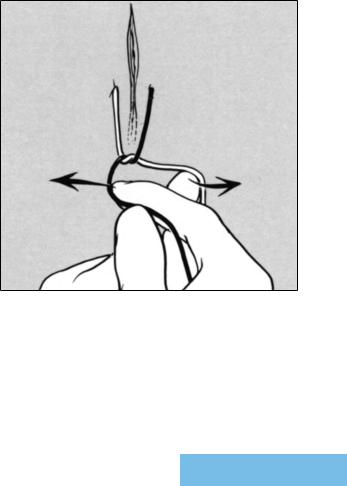 the second throw of these knots, the direction of the suture ends must be reversed, with an accompanying reversal of the position of the surgeon’s hand. As the surgeon’s hands move toward or away from his body, the movements of his right and left hands are in separate and distinct areas that do not cross, permitting continuous visualization of knot construction. With each additional throw, the surgeon must reverse the position of his/her hands.