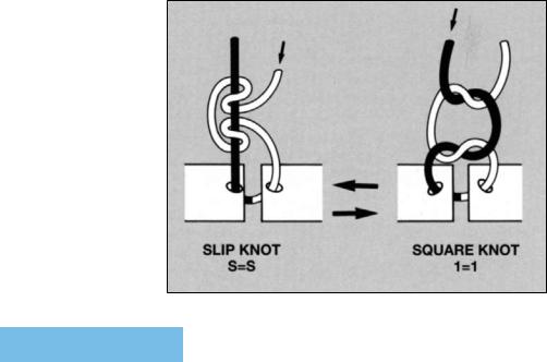 The granny knot and square knot can become a slip knot by making minor changes in the knot tying technique (Figure 5). Surgeons who do not reverse the position of their hands after forming each throw will construct slip knots. Furthermore, the application of greater tension to one ”ear” than the other encourages construction of slip knots, a practice commonly encountered in tying deep-seated ligatures.20