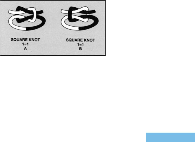 Figure 8. Square knot (1=1) (A) is formed by first passing the free suture end up through the suture loop to create the first throw. The second throw is formed by passing the free suture end down through the suture loop. Square knot (1=1) (B)