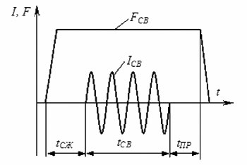К основным параметрам контактной точечной сварки относятся: сила сварочного тока (IСВ), длительность его импульса (tСВ), усилие сжатия электродов (FСВ), размеры и форма рабочих поверхностей электродов (R - при сферической, dЭ - при плоской форме). Для лучшей наглядности процесса эти параметры представляются в виде циклограммы, отражающей их изменение во времени.