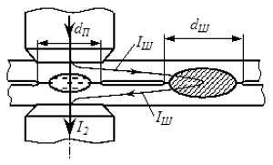 Необходимо отметить, что ток, который протекает через зону сварки (IСВ), и ток, протекающий во вторичном контуре сварочной машины (I2), различаются между собой - и тем больше, чем меньше расстояние между сварными точками. Причиной этого является ток шунтирования (Iш), протекающий вне зоны сварки - в том числе и через ранее выполненные точки. Таким образом, ток в сварочной цепи аппарата должен быть больше сварочного тока на величину тока шунтирования:
