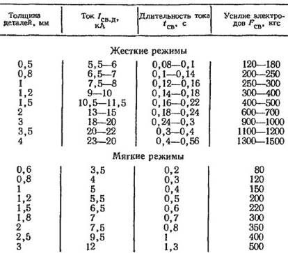 Различают жесткий и мягкий режимы сварки. Первый характеризуется большим током, малой продолжительностью токового импульса (0,08-0,5 секунд в зависимости от толщины металла) и большой силой сжатия электродов. Его применяют для сварки медных и алюминиевых сплавов, обладающих большой теплопроводностью, а также высоколегированных сталей для сохранения их коррозионной стойкости.