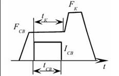 Как уже отмечалось, для проковки сварной точки с целью снятия напряжений и повышения плотности ядра, технология контактной точечной сварки в некоторых случаях предусматривает кратковременное увеличение силы сжатия после отключения электрического импульса. Циклограмма в этом случае выглядит следующим образом.