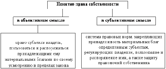 Право собственности - совокупность юридических норм, закрепляющих и охраняющих принадлежность материальных благ определенным лицам или коллективам, предусматривающих объем и содержание прав собственника в отношении принадлежащего ему имущества, способы и пределы осуществления этих прав. Право собственности заключается в том, что собственник по своему усмотрению владеет, пользуется и распоряжается принадлежащим ему имуществом.