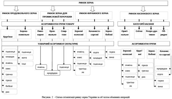 Зерновий ринок неоднорідний, він складається з ринків: продовольчого, фуражного і зерна для промислової переробки, а також ринку насіння. Ринки, природно, відрізняються один від одного, насамперед тим, який товар на них пропонується, тобто за об'єктом обмінних операцій (рис. 2).