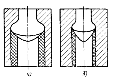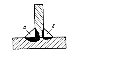 Для снижения доли основного металла в металле шва дуговую сварку среднеуглеродистых сталей, как правило, ведут с разделкой кромок на режимах, обеспечивающих минимальное проплавление основного металла и максимальное значение коэффициента формы шва. Для иллюстрации сказанного на рис. 3 показаны угловые швы, сваренные под флюсом на режимах, типичных для сварки низкоуглеродистой (а) и среднеуглеродистой (б) стали.