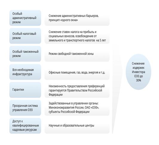 Каждую особую экономическую зону государство наделяет специальным юридическим статусом, который дает инвесторам ОЭЗ ряд налоговых льгот и таможенных преференций, а так же гарантирует доступ к инженерной, транспортной и деловой инфраструктуре. Издержки инвесторов при реализации проектов в ОЭЗ в среднем на 30% ниже общероссийских показателей.