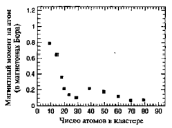 Рис. 17. Зависимость магнитного момента атомов в наночастицах рения от количества атомов в них.