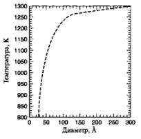 На рис. 18 показана зависимость температуры плавления наночастиц золота в зависимости от их диаметра. Среднее расстояние между атомами в кластере меди приближается к значению в объемном материале при размерах кластера около 100 атомов. Вообще оказывается, что разные физические свойства кластеров достигают значений, характерных для объемных материалов, при разных размерах кластера. Размеры кластера, при которых происходит переход к поведению объемного материала, оказывается зависящим от измеряемой характеристики.