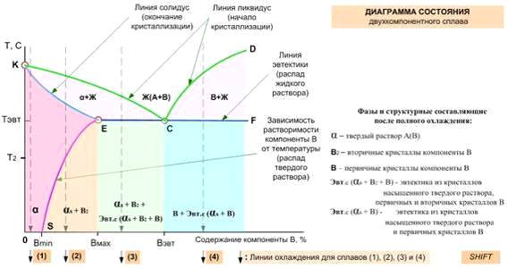 Эвт (α+В) - зерна твердого раствора α и кристаллы компоненты В и т.д.
