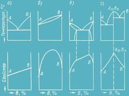 При образовании механической смеси (диаграмма состояния первого типа) свойства сплавов (например, твердость, электрическое сопротивление, коэрцитивная сила) изменяются линейно (рис. 3, а). Следовательно, в случае образования механической смеси свойства сплавов имеют среднее значение из количественных значений свойств компонентов.