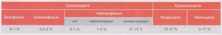 Усі лейкоцити, залежно від наявності або відсутності цитоплазматичної зернистості, поділяються на гранулоцити (які містять специфічну зернистість) та агранулоцити (котрі такої зернистості не містять). З урахуванням тинкторіальних властивостей (кольору зернистості) та форми ядер гранулоцити поділяються на: нейтрофільні, серед яких розрізняють юні, паличкоядерні та сегментоядерні форми; еозинофільні (або ацидофільні чи оксифільні) та базофільні. Агранулоцити, у свою чергу, поділяються на лімфоцити та моноцити