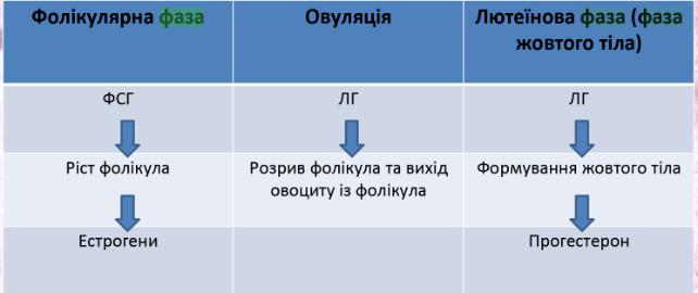 (3) лютеальну, яка триває від 14 по 28 добу циклу. Під час цієї фази постовуляторний фолікул перетворюється на жовте тіло, що продукує прогестерон - стероїдний гормон, під впливом якого матка готується до імплантації зародка