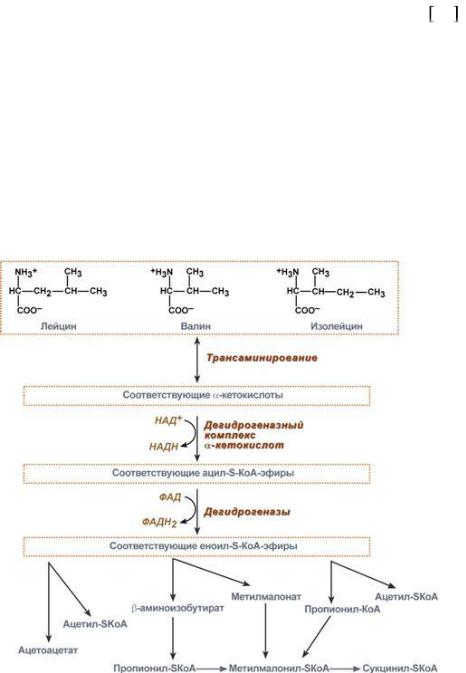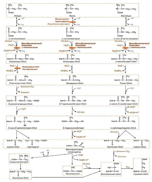 (валин), кетогенных (лейцин) или к обоим типам (изолейцин). Учитывая сходство начальных реакций катаболизма все три аминокислоты рассматриваются вместе.