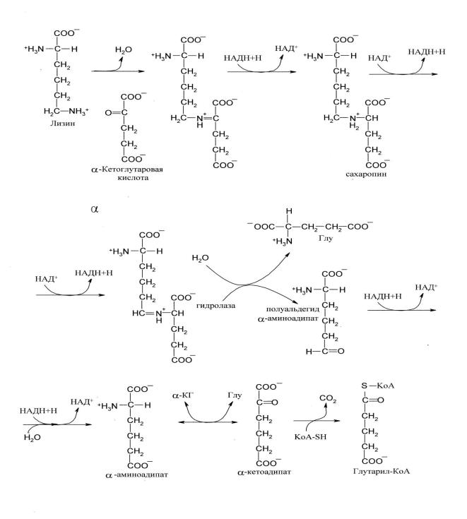 соединения в сахаропин при участии соответствующей дегидрогеназы, а затем окисление сахаропина другой дегидрогеназой. Расщепление продукта водой приводит к образованию L-глутамата и L-альфа-аминоадипат-дельта-