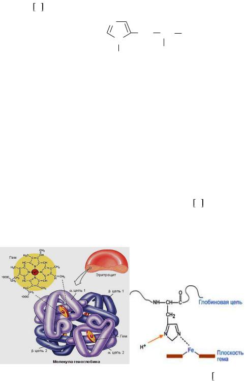 (1961 г.) является незаменимой аминокислотой для детей, а по мнению Kopple, Swendseid (1974 г.) – и для взрослых. Дневная потребность в гистидине составляет 1,5 – 2,0 гр. Отсутствие гистидина замедляет синтез гемоглобина и приводит к развитию анемий в связи с тем, что белковая часть гемоглобина требует достаточно большого количества гистидина 1 . Это объясняется тем, что гем связан с глобиновым компонентом через гистидиновые остатки в полипептидных цепях молекулы гемоглобина (рис. 2).