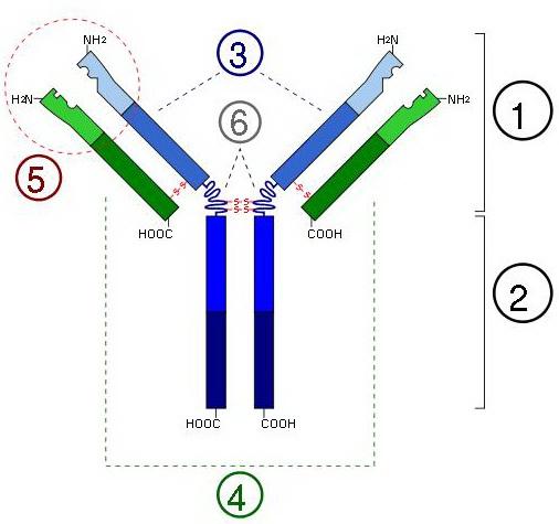 1) Fab (Участок связывания антигена (Fab, fragment antigen binding) — это участок молекулы иммуноглобулина, который связывает антиген. Fab состоит из одного константного и одного вариабельного домена легкой и тяжелой цепей. Эти домены образуют паратоп — сайт связывания антигена на N-конце. Вариабельные домены связывают эпитоп специфических антигенов). Fc и Fab могут быть получены разрезанием молекулы иммуноглобулина ферментом папаином, при этом из одной молекулы мономерного иммуноглобулина образуются два Fab и один Fc. Фермент пепсин разрезает иммуноглобулины ниже шарнирного участка и при этом образуется один мономер Fc и один F(ab)2);