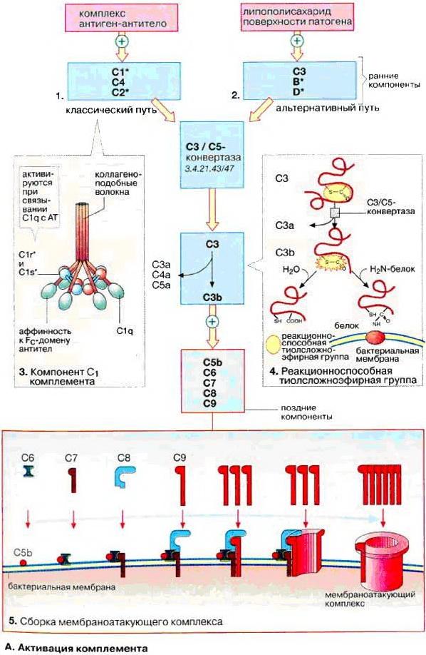 С1q связывается прямо с поверхностью патогена, это ведет к конформационным изменениям молекулы С1q, и вызывает активацию двух молекул сериновых протеаз С1r. Они расщепляют С1s (тоже сериновую протеазу). Потом комплекс С1 связывается с С4 и С2 и затем расщепляет их, образуя С2а и С4b. С4b и С2а связываются друг с другом на поверхности патогена, и образуют С3-конвертазу классического пути, С4b2а. Появление С3-конвертазы приводит к расщеплению С3 на С3а и С3b. С3b образует вместе с С2а и С4b С5-конвертазу классического пути. С5 расщепляется на C5a и C5b.C5b остается на мембране и соединяется с комплексом C4b2a3b.Потом соединяются С6, С7, С8 и С9,которая полимеризуется и возникает трубочка внутри мембраны. Тем самым нарушается осмотический баланс и в результате тургора бактерия лопается. Классический путь действует более точно, поскольку так уничтожается любая чужеродная клетка.
