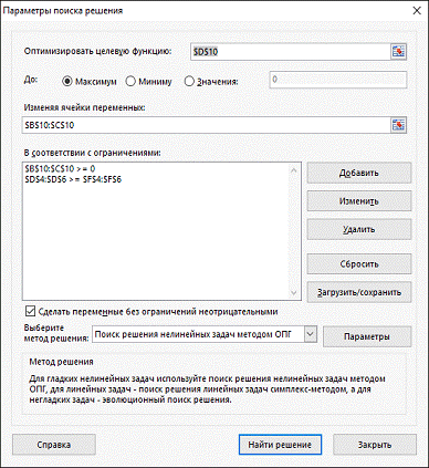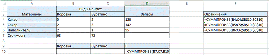 В ячейку D10 необходимо ввести формулу =СУММПРОИЗВ(B10:C10;B7:C7), которой записана целевая функция.