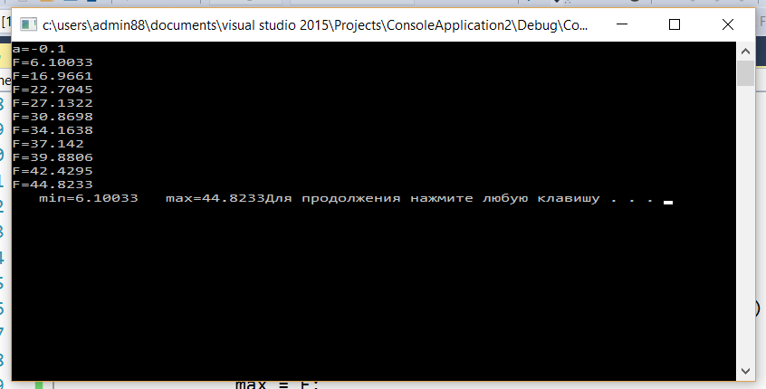В третьей части (30-56 строки) табулируем функцию, используя цикл «for», в котором находим соответственные min и max значения функции, выводим на экран получившиеся значения