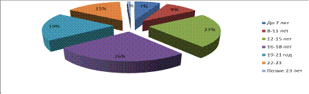 15 % - в возрасте от 21 до 23 лет и лишь 1 % опрошенных - позже 23х лет. Как мы