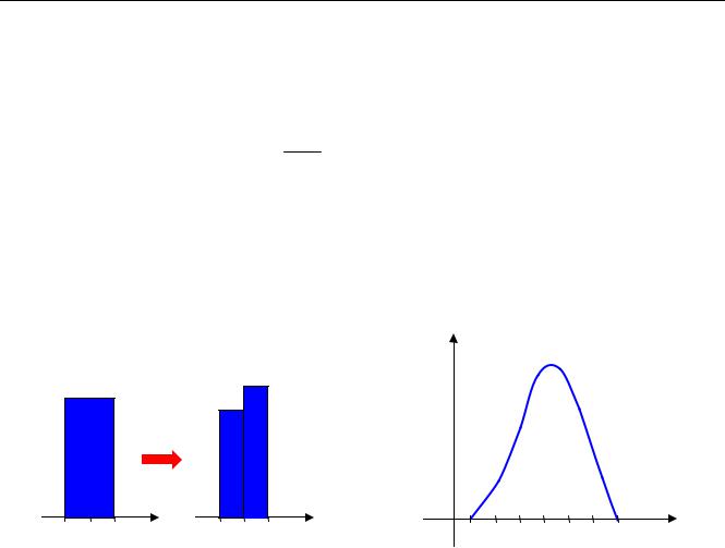 Такое деление можно выполнять и для нормированной гистограммы (с единичной площадью). В пределе при ∆ → 0 (и N → ∞ ) мы получаем прямоугольники бесконечно малой ширины. Через их «вершины» можно провести некоторую линию. Она представляет собой график функции, которую называют плотностью распределения вероятностей (или просто плотностью распределения) случайной величины X и обозначают f (x) (здесь x – одно из допусти-