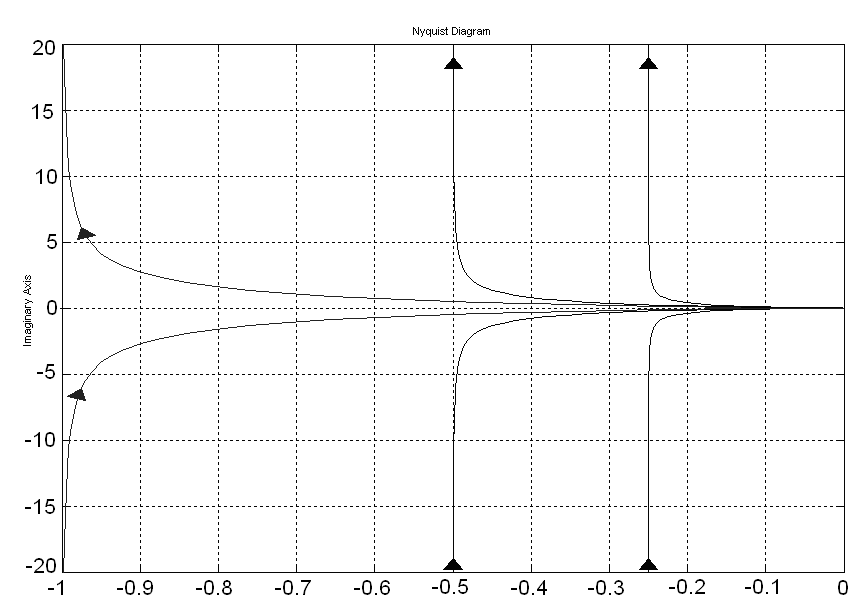 Определим частотный годограф Найквиста, выполнив команду nyquist(w1,w2,w3)