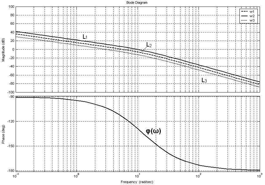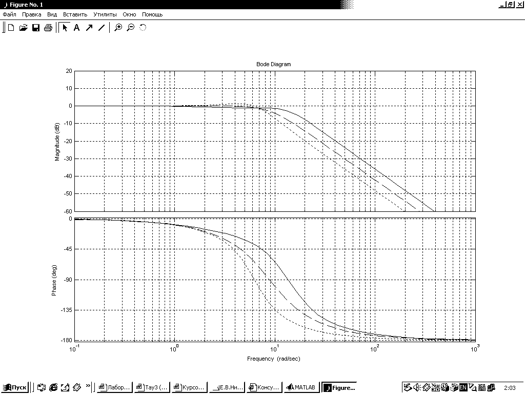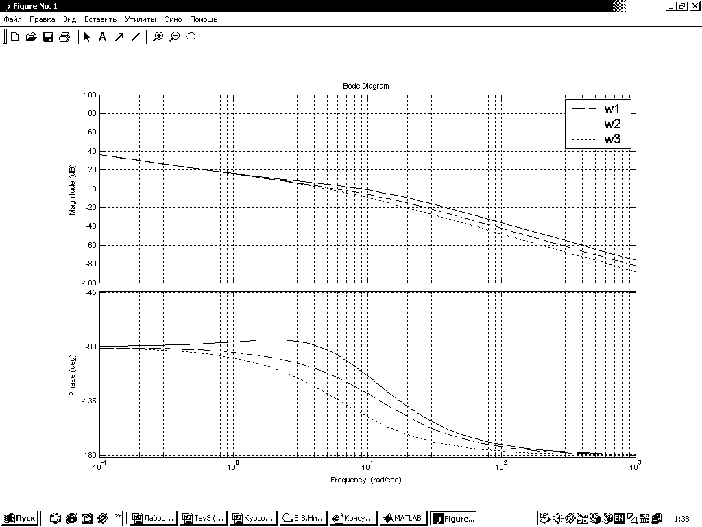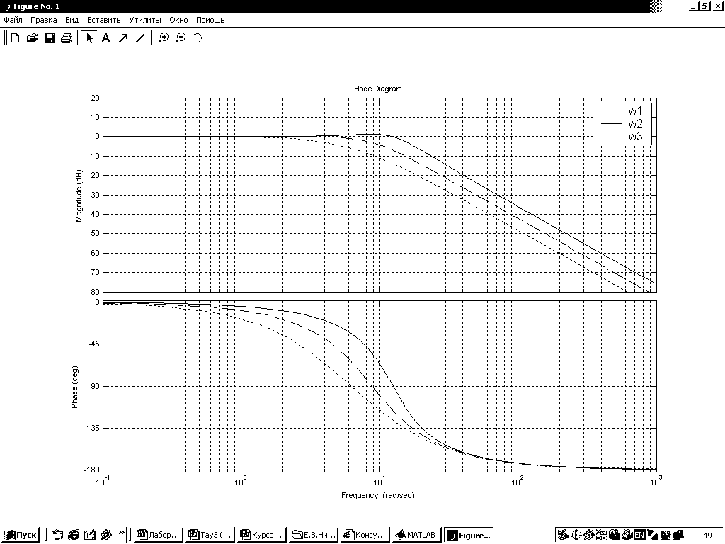 Построим ЛАЧХ и ЛФЧХ (диаграмму Боде), используя команду bode(w1,w2,w3).