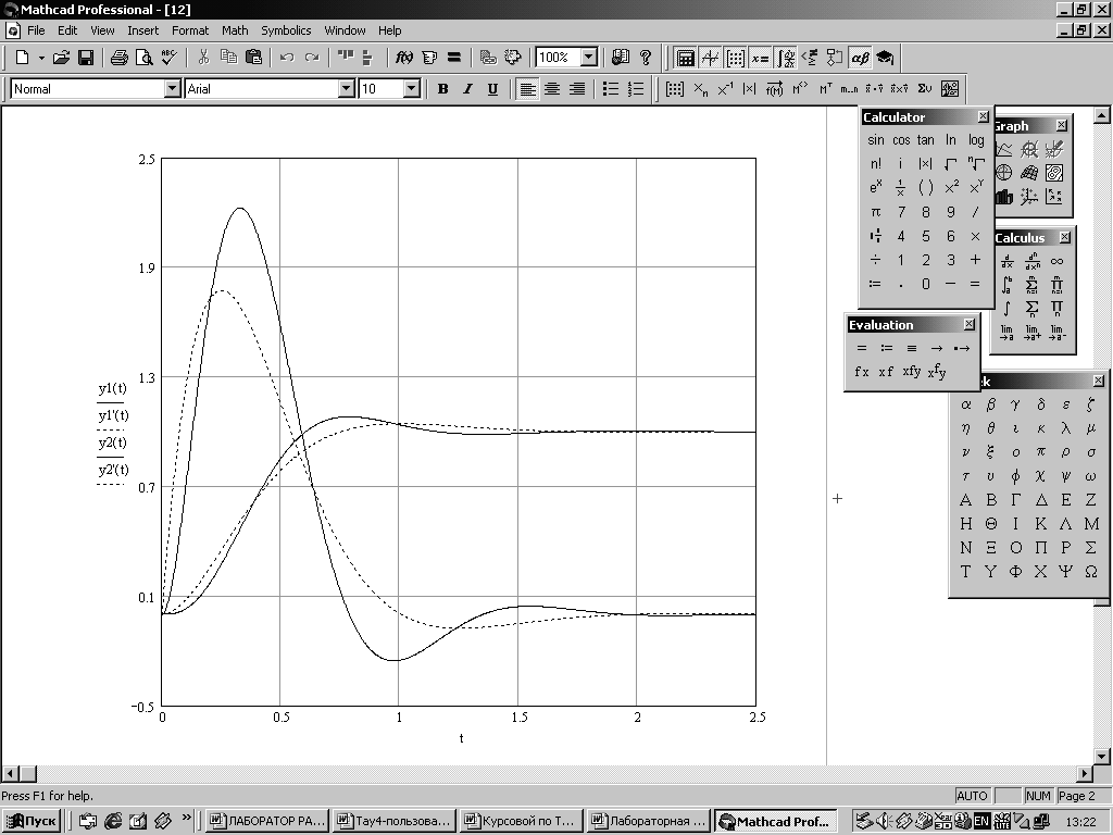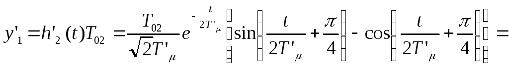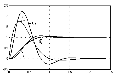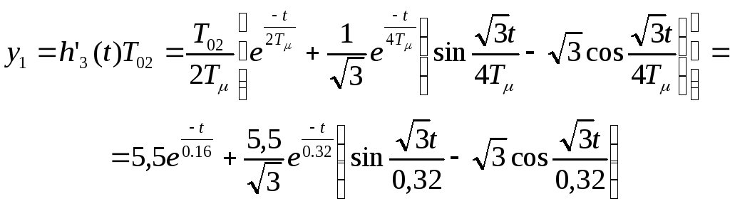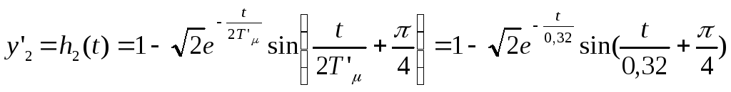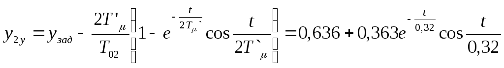 Как указывалось выше, при исследовании двухконтурной САР необходимо произвести расчёт переходных процессов в системе как при управляющем, так и возмущающем воздействии. При этом расчёт производить при представлении внутреннего замкнутого контура колебательным звеном (5.2) и апериодическим звеном первого порядка (5.3). Т.е. переходный процесс рассматривается соответственно при задающем воздействии для выходной величины внутреннего контура y1y и y’1y и выходной величины внешнего контура y2y и y’2y и при возмущающем воздействии для y1в и y’1в и для y2в и y’2в.