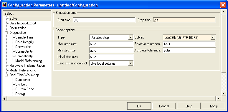 Перед выполнением расчетов необходимо предварительно задать параметры расчета. Задание параметров расчета выполняется в панели управления меню Simulation/Configuration Parameters.