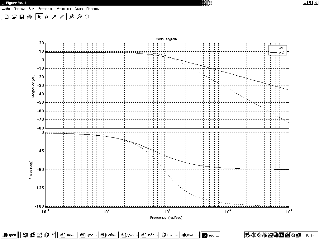 Построим ЛАЧХ и ЛФЧХ (диаграмму Боде), используя команду bode(w1,w2).