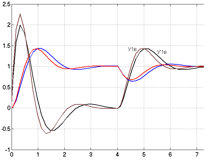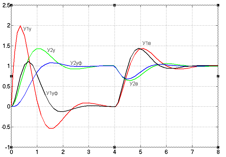 В связи с тем, что фильтр не оказывает влияние на реакцию системы при возмущающем воздействии, поэтому в данном случае переходный процесс рассматривается для выходных величин y1в и y2в.