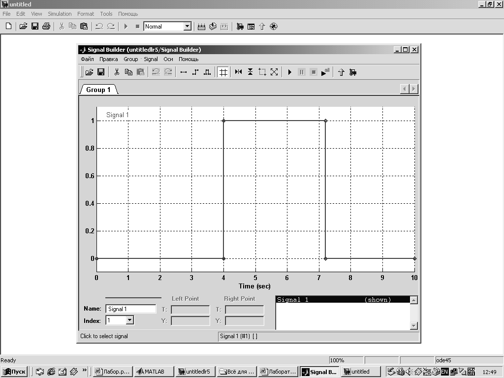 Для формирования возмущающего воздействия используем блок Signal Builder. Время наброса нагрузки 50Tμ (в данном примере 50Tμ=4 с), конечное время 90Tμ (в данном примере 90Tμ=7,2 с), амплитуда возмущающего сигнала равна единице. С учётом всех этих параметров блок Signal Builder будет выглядеть так, как показано на рисунке 6.5.