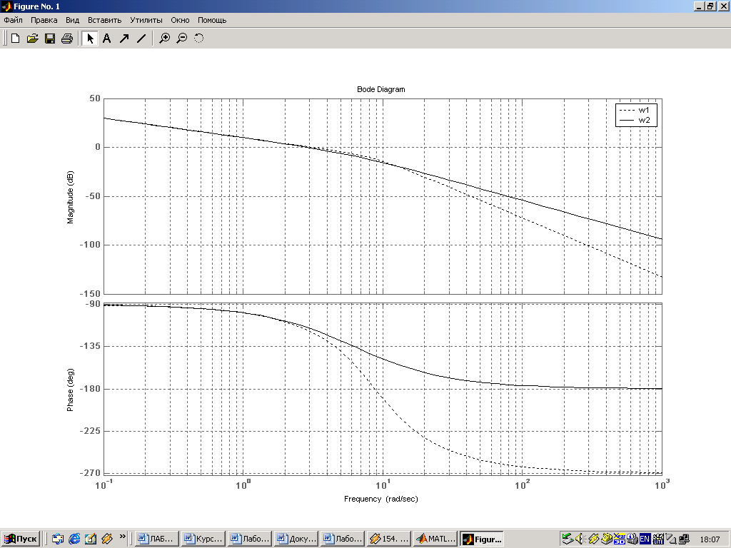 2. Построим ЛАЧХ и ЛФЧХ (диаграмму Боде) , используя команду bode(w1,w2).