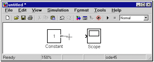Для соединения блоков необходимо сначала установить курсор «мыши» на выходной порт одного из блоков. Курсор при этом превратится в большой крест из тонких линий (Рис. 1.10).
