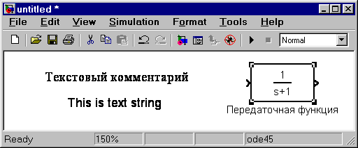 Для повышения наглядности модели удобно использовать текстовые надписи. Для создания надписи нужно указать мышью место надписи и дважды щелкнуть левой клавишей мыши. После этого появится прямоугольная рамка с курсором ввода. Аналогичным образом можно изменить и подписи к блоками моделей. На рис. 1.9 показаны текстовая надпись и изменение надписи в блоке передаточной функции. Следует иметь в виду, что рассматриваемая версия программы (Simulink 6.1) не адаптирована к использованию кириллических шрифтов, и применение их может иметь самые разные последствия: - отображение надписей в нечитаемом виде, обрезание надписей, сообщения об ошибках, а также невозможность открыть модель после ее сохранения. Поэтому, применение надписей на русском языке для текущей версии Simulink крайне нежелательно.