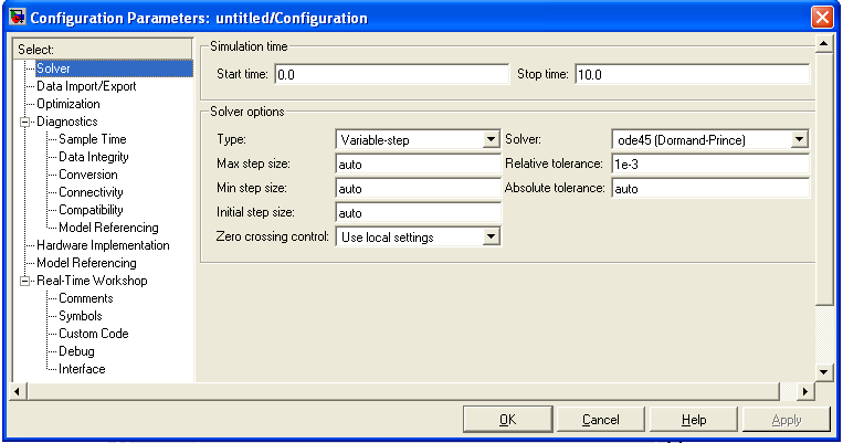 Мах step size - максимальный шаг расчета. По умолчанию он устанавливается автоматически (auto) и его значение в этом случае равно (StopTime — StartTime)/50. Довольно часто это значение оказывается слишком большим, и наблюдаемые графики представляют собой ломаные (а не плавные) линии. В этом случае величину максимального шага расчета необходимо задавать явным образом.