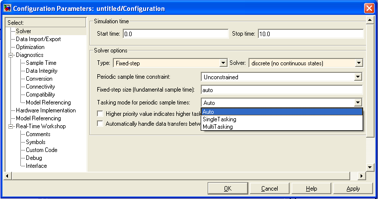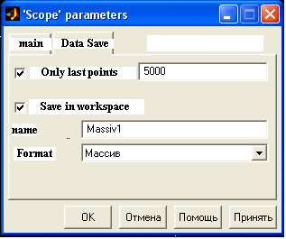 При моделировании непрерывных систем с использованием переменного шага необходимо указать точность вычислений: относительную (Relative tolerance) и абсолютную (Absolute tolerance). По умолчанию они равны соответственно 10-3 и auto.