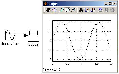 Scope cтроит графики исследуемых сигналов в функции времени. Позволяет наблюдать за изменениями сигналов в процессе моделирования. Изображение блока и окно для просмотра графиков показаны на рис. 1.16.