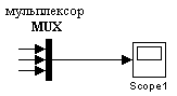 Далее необходимо сформировать требуемый массив данных (матрицу) в рабочей области MATLAB. Эта матрица должна отражать, как правило, результаты моделирования, представленные графически в блоке виртуального осциллографа (Scope). Формирование требуемого массива данных производится при помощи стандартных меню осциллографа. Необходимым условием возможности формирования указанной матрицы является наличие только одного входа у осциллографа. При желании сгруппировать несколько сигналов в одну матрицу целесообразно воспользоваться мультиплексором (блок Mux из раздела Signal Routing) по схеме, представленной на рис. 1.21.