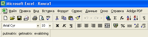 Excel появится новая панель инструментов связи со средой MATLAB на рис. 1.20. содержащая команды putmatrix, getmatrix, evalstring. Следует отметить, что указанная дополнительная панель инструментов сохраняется при последующих запусках Microsoft Excel. При выборе команды getmatrix (получить матрицу) Excel предложит открыть основное окно MATLAB, при подтверждении открытия запустит программу и будет готов принять массив данных из рабочей области (Workspace) MATLAB. В дополнительно открывшемся окне Excel предложит ввести имя матрицы, которая должна находится в рабочей области MATLAB.