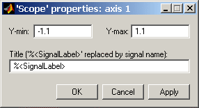 3. Щелкнуть правой клавишей “мыши” в окне графиков и, выбрать команду Axes properties… в контекстном меню. Откроется окно свойств графика, в котором с помощью параметров Y-min и Y-max можно указать предельные значения вертикальной оси. В этом же окне можно указать заголовок графика (Title), заменив выражение %<SignalLabel> в строке ввода. Окно свойств показано на рис.1.18(а).