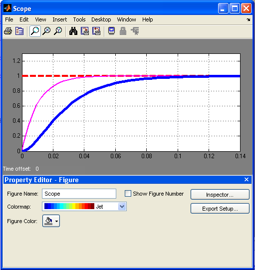 Окно блока Scope отображающее графики сигналов имеет очень ограниченные возможности по изменению внешнего вида окна и графиков. Фактически можно изменять лишь масштаб отображения графиков, а команды изменения цветов линий и фона окна, толщины линий, размера и типа шрифтов и т.п. недоступны. Чтобы получить доступ к этим возможностям необходимо после проведения расчетов открыть окно блока Scope и в основном окне MATLAB ввести следующие команды: