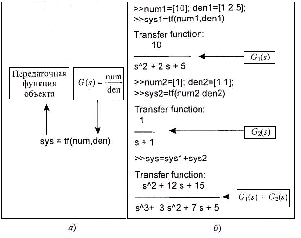 Рис. 1.38 (а) Функция tf; (б) Применение функции tf для образования передаточных функций объектов и их сложение с помощью